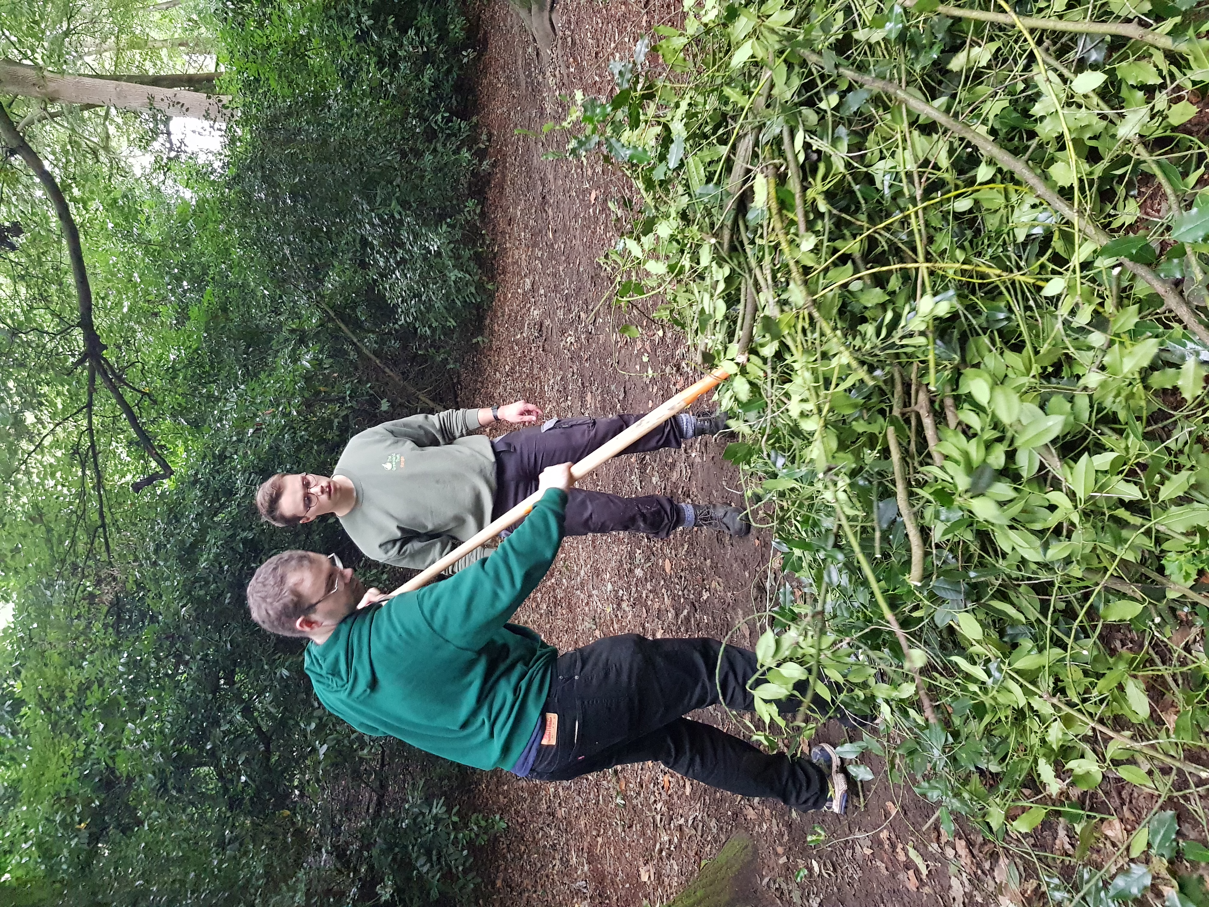 We were thrilled when our ranger gave the all-clear after there was a chance that another storm would cancel yet another action day. We were even happier to see a strong turnout, which included Linda and Jan, two potential new members. The task was to cut laurel, rhod and holly around the Plantation Road entrance where a few old and unsafe trees had to come down last year. This was a good opportunity to give a break to some particular leftover specimens. The Oak planted for Kate & Williams wedding, the unusual Chinkapin and a Yew. Additionally, the pathway needed opening up and you can see from the before and after photo the difference made. Everyone did well to bring their own cup, and Dave prepared us a hot brew on the Kelly kettles during breaktime. We were delighted to hand out our first branded hats today, received by Charlie and Brett with happy smiles. It is a small thing, but we are proud to have your help, value you very much and hope you feel proud to wear your hat when the occasions arise.