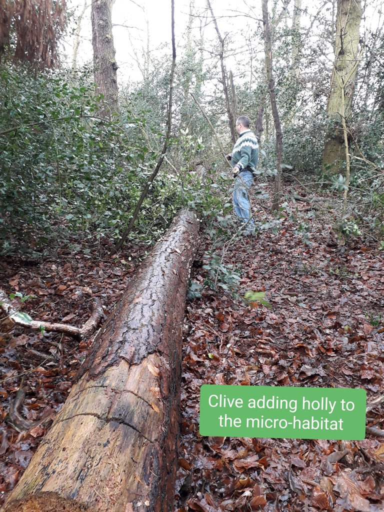 Some of the holly was put through the woodchipper and the output sprayed onto the wood floor for mulch, which decomposes and returns carbon to the soil. The mulch helps conserve soil moisture, and moderate soil temperature improving the fertility of the soil and it suppresses weed growth. The rest of the holly was used to create micro-habitats suitable for worms, woodlice, fungi and other organisms which help with decomposition. It has taken us a good few sessions to complete the whole wood but today we achieved just that!