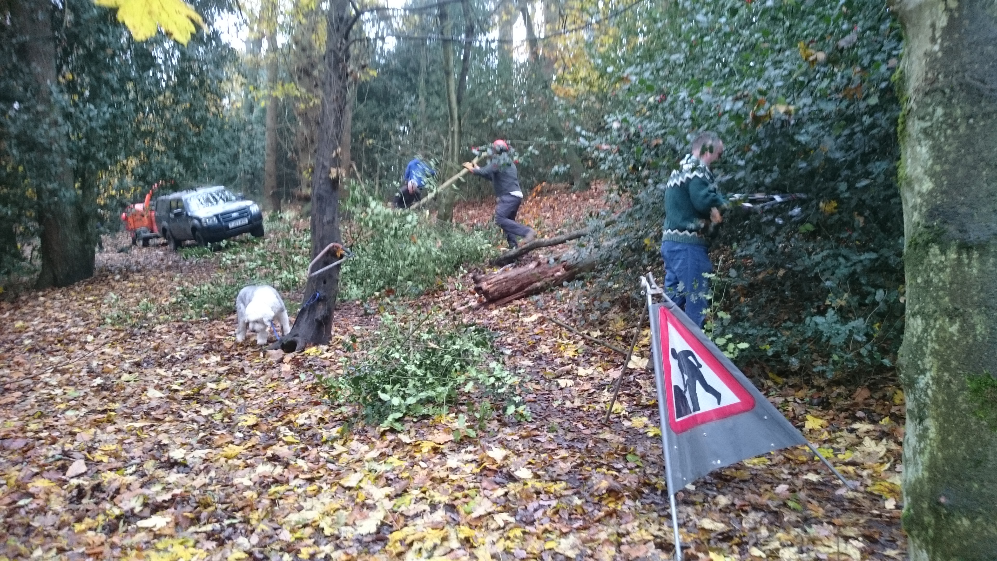 After John (Greensand Trust) gave us our instructions and made the work area safe we continued our battle against the invasive holly. Although it is quite fascinating to see a holly tree branch that has drooped into the ground, taken root and started growing out again as a bush, holly can grow rapidly, dominating the undergrowth of woodland and competing with the native plants for space, light and nutrients. So, to allow the special trees at Knollswood a fair chance, and to give walkers a clear path, we cut the holly back.