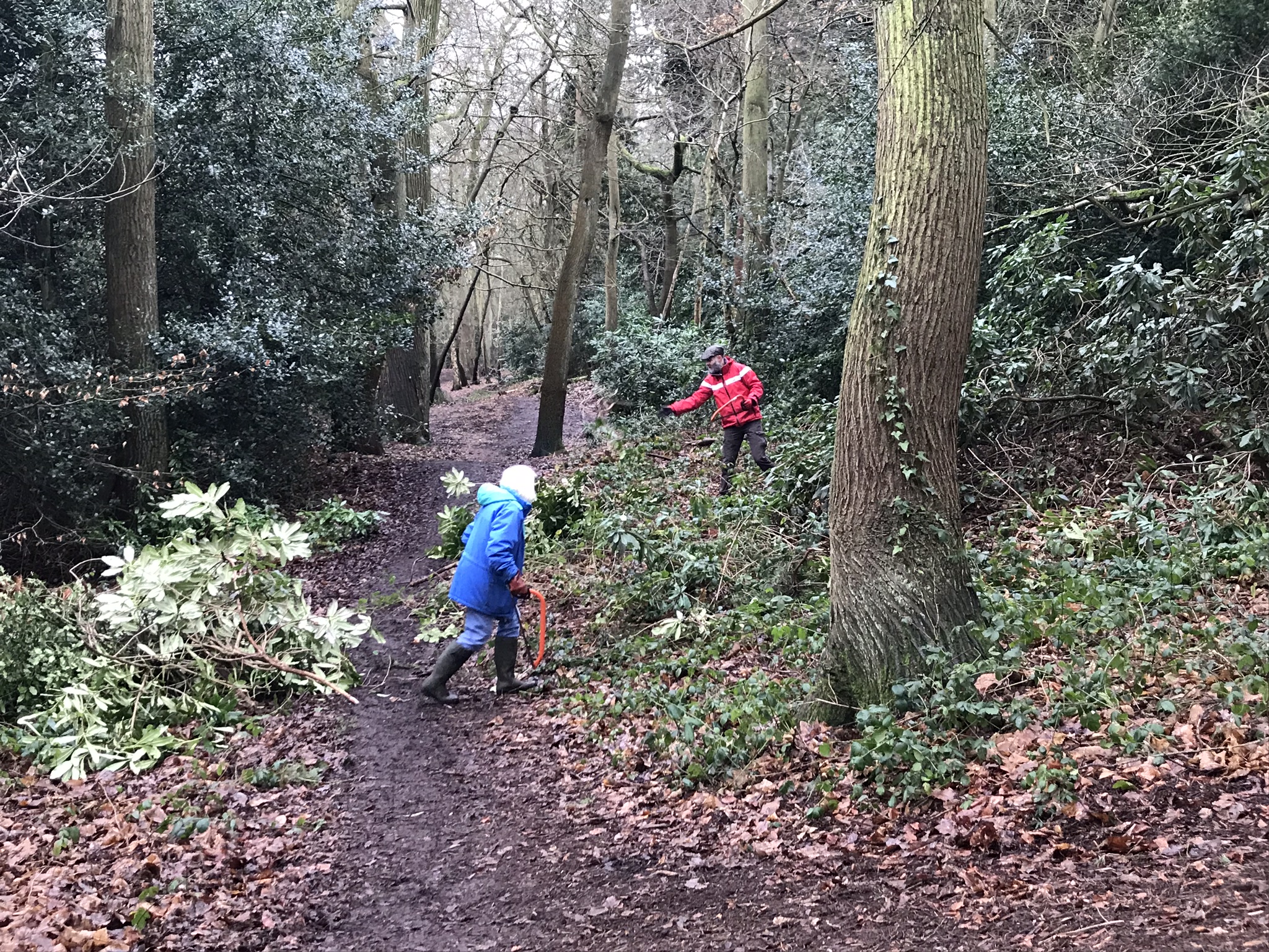 The task for this session was to cut back some of the shrubs that had begun to encroach on Monkey Puzzle avenue, mainly laurel and rhododendrons. Despite a smaller group of volunteers than usual, much was achieved and the path has been widened along most of its length. People who walk in Knolls Wood regularly will have noticed the two areas that have been cleared: one to the north, next to Sandy Lane, and the other where the ground slopes away on the east side. In both these places some trees had come down in storms and others were diseased.