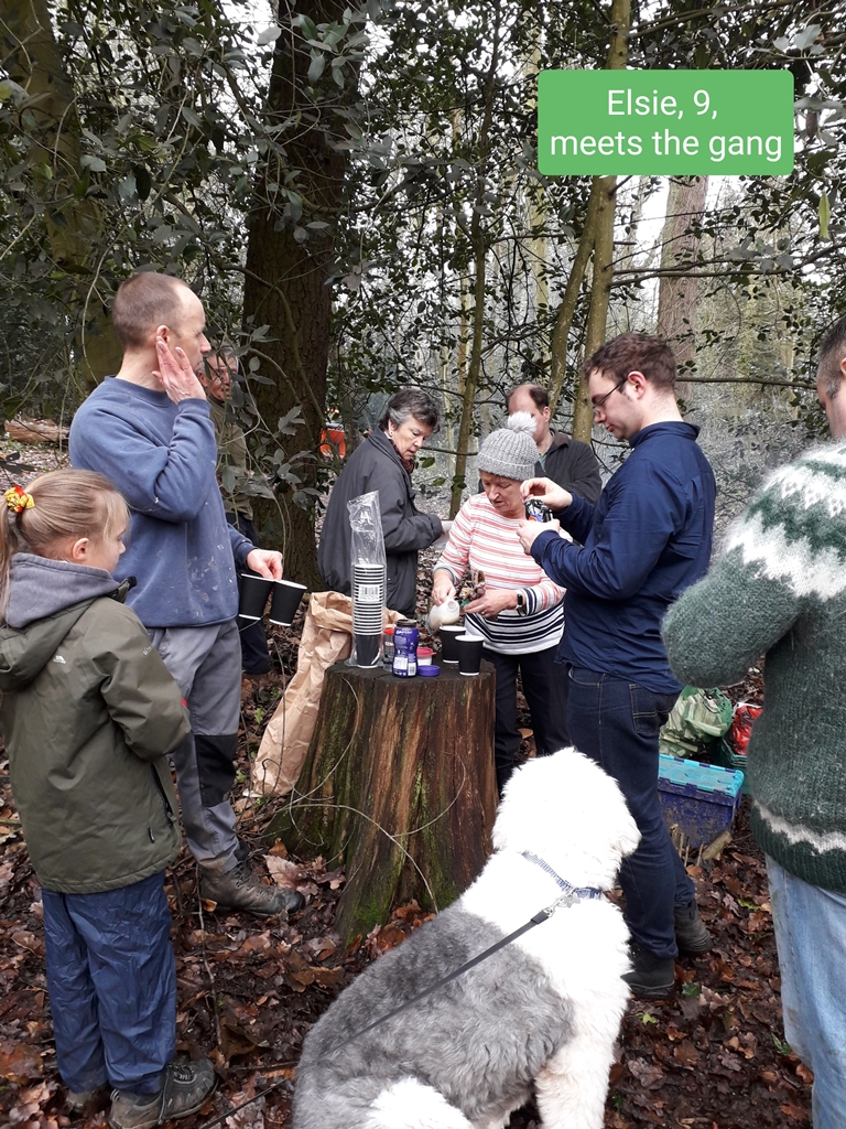 Not to forget the other Very Important Part of the event, the tea break. John got his Kelly Kettle ready for about 11:00 and he brought a plentiful supply of biscuits, to enjoy with a good chat. We’re all very excited to see signs of what will soon be a beautiful carpet of bluebells. Also, today we welcomed our newest, youngest member – Elsie, daughter of Charlie, 9 years old.